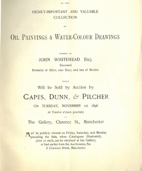 On 1st November 1898 at 12 o’clock prompt, there was a sale at Messrs Capes, Dunn and Pilcher in Manchester “Of The Highly-Important and Valuable collection of Oil Paintings & Water-Colour Drawings formed by John Whitehead esq. Deceased, formerly of Elton, Bury and late of Buxton”.