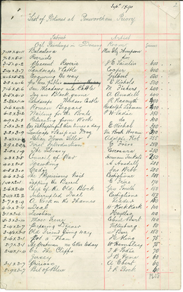 Other oil paintings on the list are by Crome, Escosura, Frere, Louis Haghe, Leader, Morland, Nasmyth, Erskine Nicol, Piot, Roberts, T. Sidney ‘Cow’ Cooper, van Schendel, Sadee, Tenkate, plus watercolours and drawings by Fisher, Henry Gastineu (150 guineas), Sir John Gilbert, the Fylde artist Ansdell, Josep Tapiro the Tangiers based artist (valued at 400 guineas) and W. Hunt.